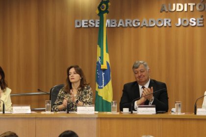 Presidente Eunice Haddad com o desembargador Fernando Antonio de Almeida e a juíza Márcia Cristina de Barros