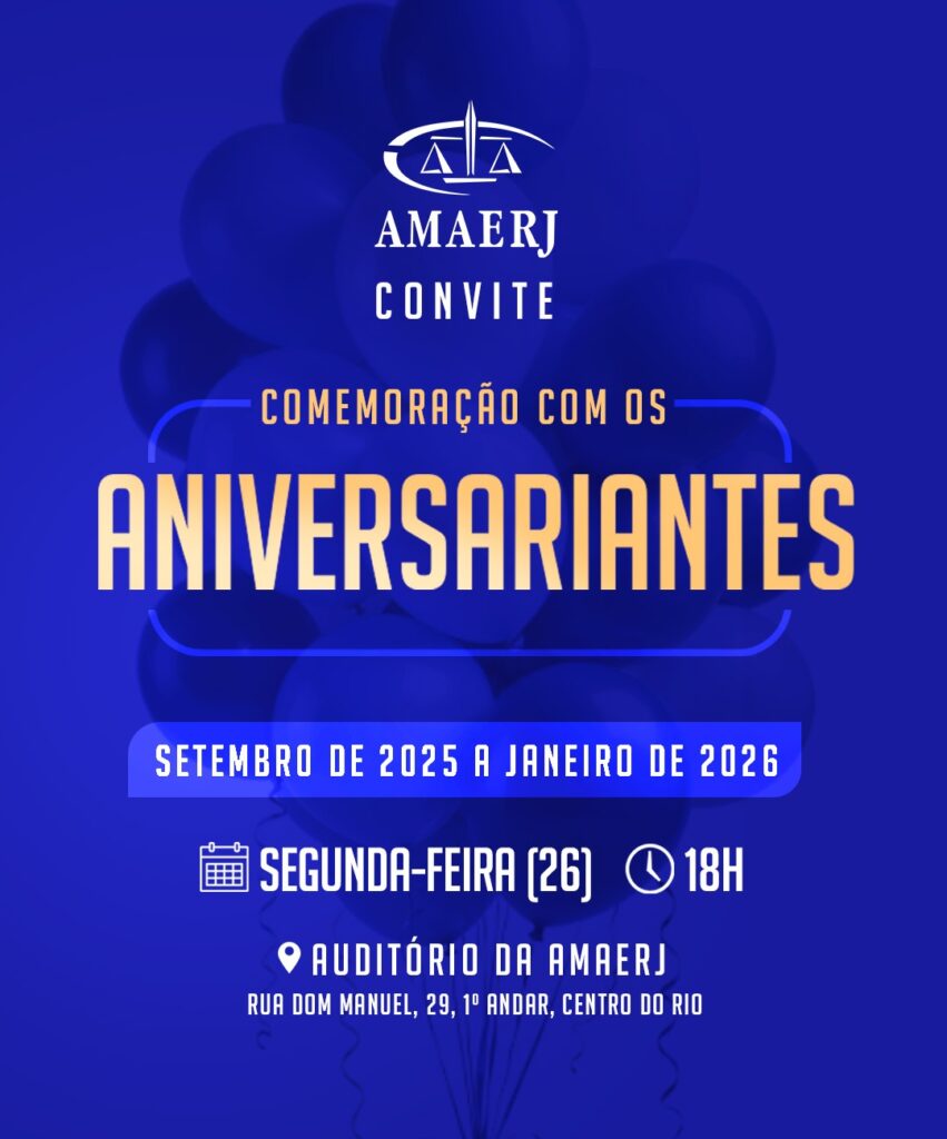 A AMAERJ promoverá, na próxima segunda-feira (26), o tradicional evento de comemoração com aniversariantes. Serão parabenizados os associados que aniversariam nos meses de setembro, outubro, novembro, dezembro e janeiro. Haverá coquetel no encontro, que acontecerá às 18h, no auditório da Associação (Rua Dom Manuel, nº 29, 1º andar, térreo, Centro do Rio).