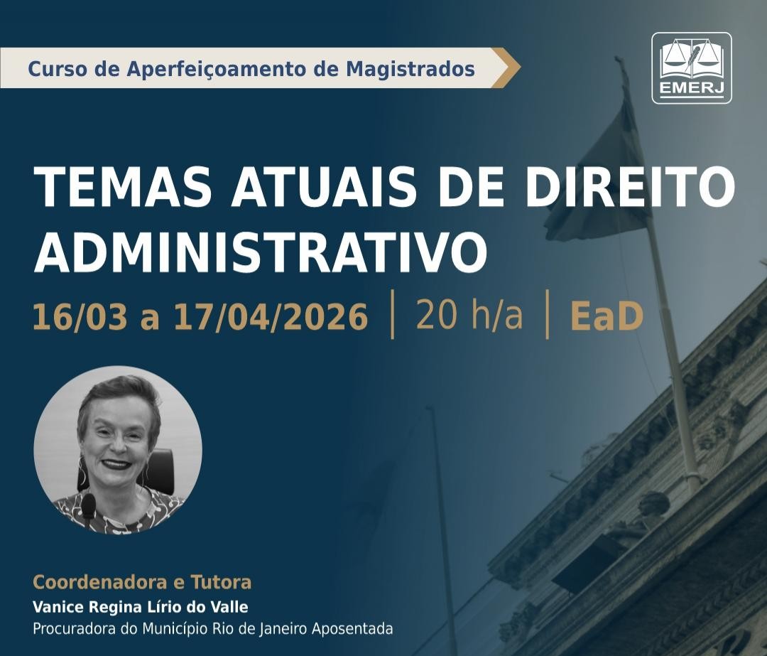 A Escola da Magistratura do Rio de Janeiro (EMERJ) vai realizar, de 16 de março a 17 de abril, o curso de aperfeiçoamento de magistrados “Temas Atuais de Direito Administrativo”. A formação, realizada no formato Educação a Distância (EaD), é coordenada pela procuradora aposentada Vanice Valle. As inscrições estão abertas até o dia 11 de março.