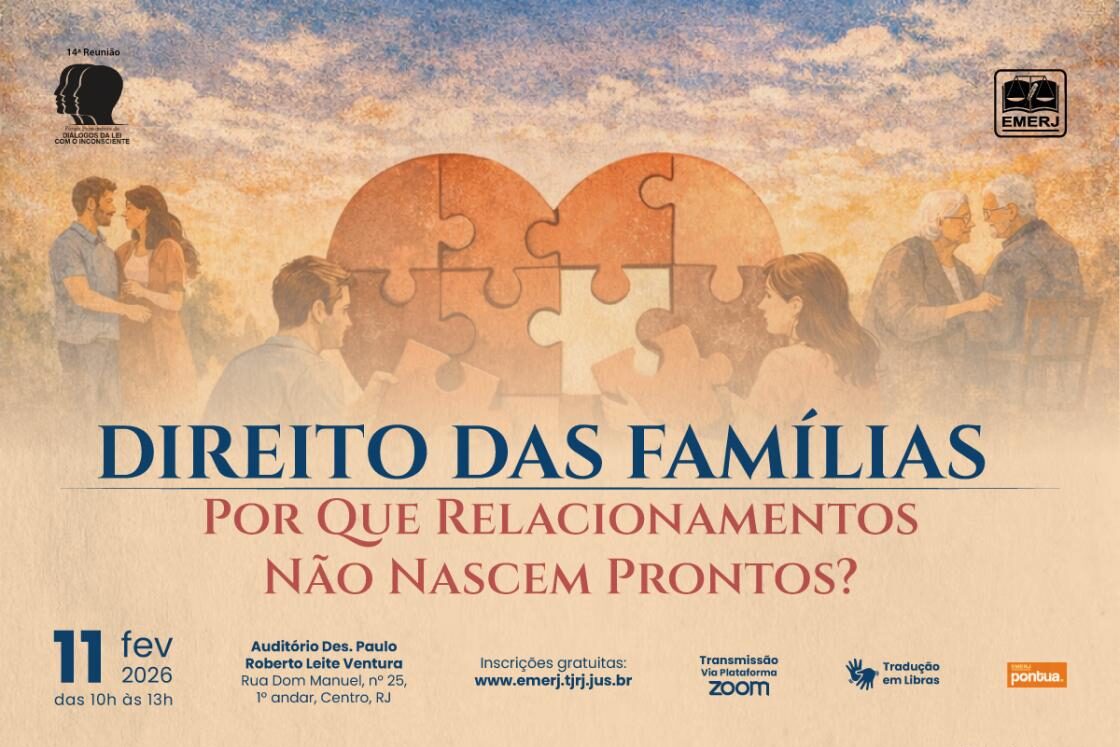 A Escola da Magistratura do Estado do Rio de Janeiro (EMERJ) promoverá, no dia 11 de fevereiro, o 14º encontro do Fórum Permanente de Diálogos da Lei com o Inconsciente. O seminário, que terá como tema “Direito das Famílias – Por que relacionamentos não nascem prontos?”, contará com a participação dos desembargadores Cristina Gaulia, presidente do Fórum, e Humberto Dalla, vice-presidente do Fórum e conselheiro de Estudos e Pesquisas da AMAERJ.