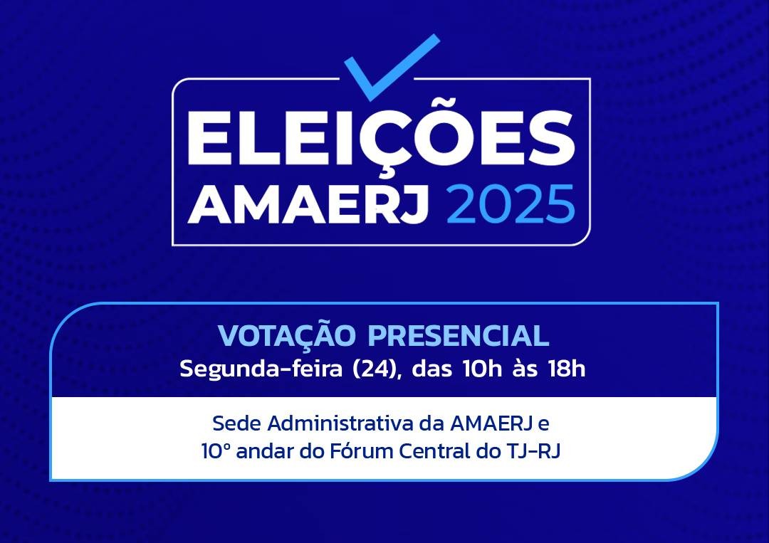 Os associados poderão votar presencialmente nas eleições da AMAERJ nesta segunda-feira (24), das 10h às 18h. Haverá urnas na Sede Administrativa e no 10º andar do Fórum Central do Tribunal de Justiça.