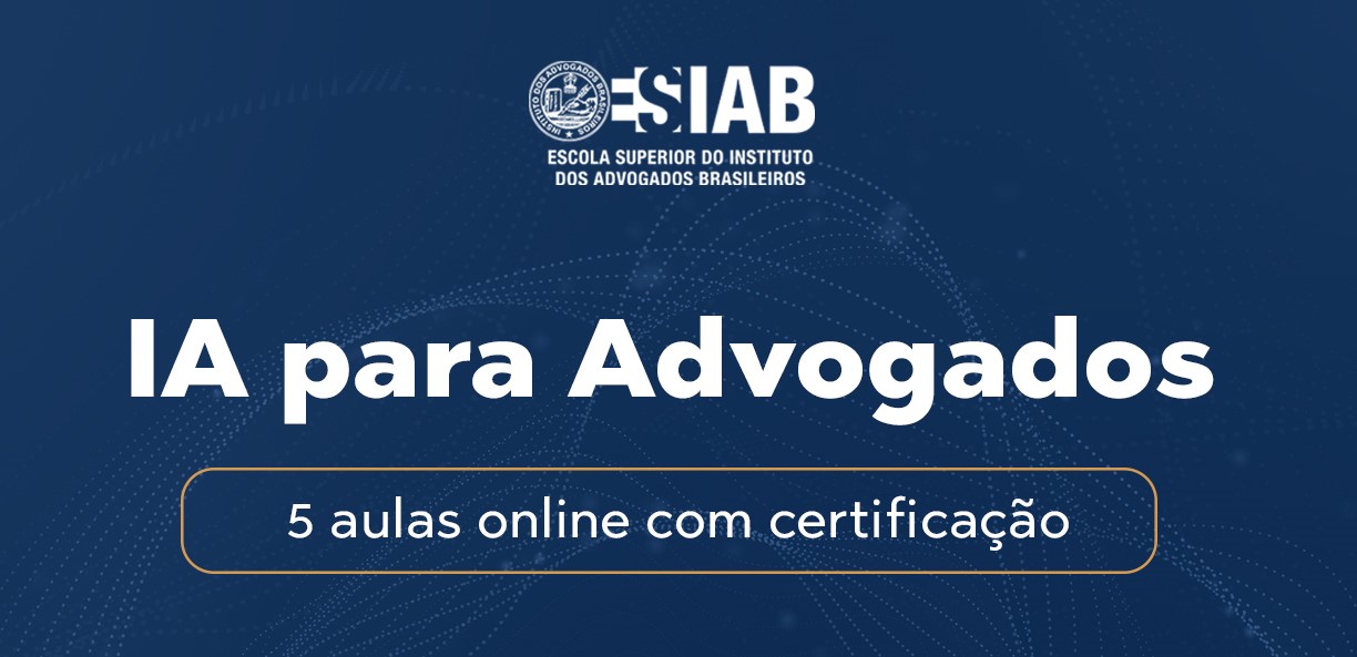 A Escola Superior do Instituto dos Advogados Brasileiros (ESIAB) vai promover o curso online “IA para Advogados”. O objetivo é capacitar profissionais do Direito a dominar o uso estratégico e ético da Inteligência Artificial no exercício cotidiano da advocacia. Serão cinco aulas com duração de duas horas cada, com início em 16 de outubro. O investimento é de R$ 497.