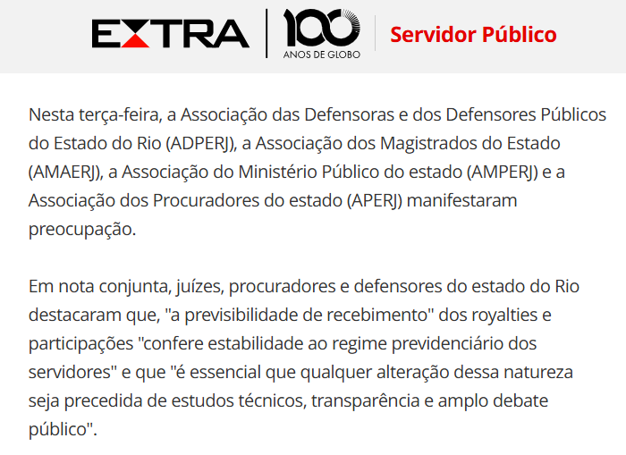 A Associação das Defensoras e dos Defensores Públicos do Estado do Rio de Janeiro (ADPERJ), a Associação dos Magistrados do Estado do Rio de Janeiro (AMAERJ), a Associação do Ministério Público do Estado do Rio de Janeiro (AMPERJ) e a Associação dos Procuradores do Estado do Rio de Janeiro (APERJ) manifestam preocupação com o Projeto de Lei nº 6.035/2025, de iniciativa do Poder Executivo, que autoriza o Estado a reter e destinar receitas de royalties e participações especiais — atualmente vinculadas ao Rioprevidência por força da Lei nº 3.189/1999 e do Decreto nº 42.011/2009 — para o pagamento de dívida com a União.