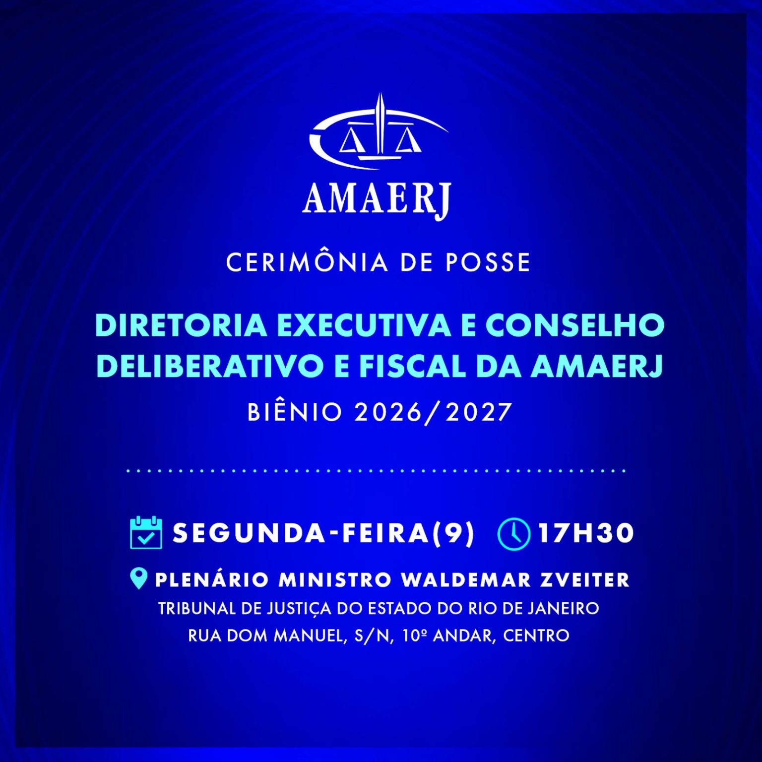 A solenidade de posse da presidente Eunice Haddad e dos demais dirigentes da AMAERJ para o biênio 2026-2027 acontecerá na segunda-feira (9), às 17h30, no Tribunal de Justiça do Rio de Janeiro (TJ-RJ). Estarão na cerimônia ministros; presidentes de tribunais e associações estaduais e federais; parlamentares; representantes do governo do estado e do município do Rio; membros do Ministério Público, da Defensoria Pública e da Procuradoria; e advogados.